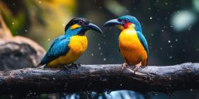 A Feathered Duet: Two vibrantly colored birds, a symphony of blue, yellow, and black, perch side-by-side on a weathered branch, engaged in a feathered conversation