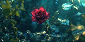 A single, vibrant red rose blooms near a tranquil stream, its reflection shimmering on the water's surface in the soft morning light.