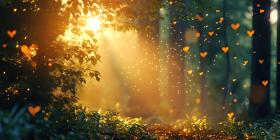 Golden rays of sunlight filter through the trees and illuminate a tranquil pond, where fallen leaves gently drift on the water's surface