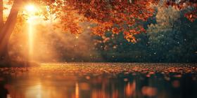 Golden rays of sunlight filter through the trees and illuminate a tranquil pond, where fallen leaves gently drift on the water's surface