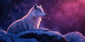 A majestic Arctic wolf, its pristine white fur blending with the snowy landscape, stands vigilant, a symbol of wilderness and power