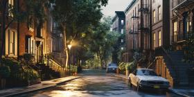 A quiet suburban street bathed in the warm glow of a setting sun, with houses lining the road and a sense of peaceful tranquility.