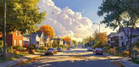 A quiet suburban street bathed in the warm glow of a setting sun, with houses lining the road and a sense of peaceful tranquility.