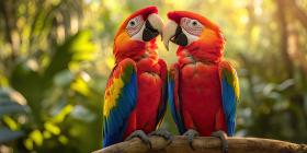 A Colorful Duo: Two vibrant blue and gold macaws perch side-by-side, their plumage a dazzling spectacle against the lush green backdrop