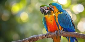 A Colorful Duo: Two vibrant blue and gold macaws perch side-by-side, their plumage a dazzling spectacle against the lush green backdrop