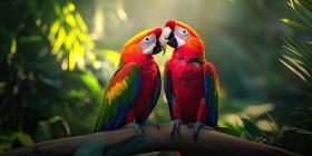 A Colorful Duo: Two vibrant blue and gold macaws perch side-by-side, their plumage a dazzling spectacle against the lush green backdrop