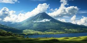 A majestic volcanic peak rises dramatically from the ocean, shrouded in clouds against a vibrant blue sky