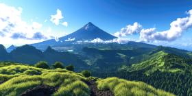 A majestic volcanic peak rises dramatically from the ocean, shrouded in clouds against a vibrant blue sky