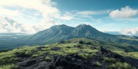 A majestic volcanic peak rises dramatically from the ocean, shrouded in clouds against a vibrant blue sky