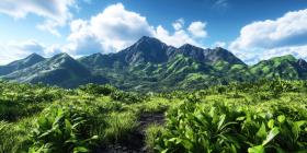 A majestic volcanic peak rises dramatically from the ocean, shrouded in clouds against a vibrant blue sky