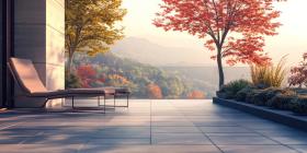 Autumnal Tranquility: A cozy lounge chair beckons on a sun-drenched patio, overlooking a breathtaking vista of autumn foliage