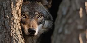 Eyes in the Dark: A lone wolf peers through a weathered wooden door, its piercing gaze and intense stare promising a story of wildness and intrigue