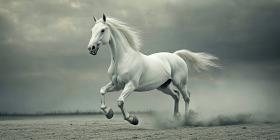 Spirit of Freedom: A majestic white stallion gallops across a golden field, mane and tail flowing in the wind, a symbol of untamed power