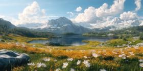 Mountain Serenity: A tranquil lake nestled amidst a vibrant meadow, where wildflowers bloom and snow-capped peaks pierce the azure sky