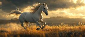 Spirit of Freedom: A majestic white stallion gallops across a golden field, mane and tail flowing in the wind, a symbol of untamed power
