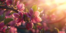 Awakening of Spring: Delicate pink blossoms unfurl on a branch, bathed in the warm glow of the rising sun, ushering in the season of renewal