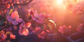 Awakening of Spring: Delicate pink blossoms unfurl on a branch, bathed in the warm glow of the rising sun, ushering in the season of renewal