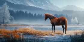 Winter's Majesty: A majestic chestnut horse stands tall in a snowy landscape, its coat dusted with frost, a symbol of resilience and beauty in the face of winter