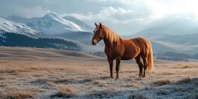 Winter's Majesty: A majestic chestnut horse stands tall in a snowy landscape, its coat dusted with frost, a symbol of resilience and beauty in the face of winter