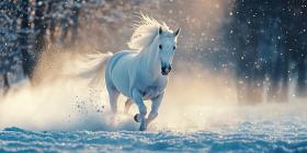 Winter's Majesty: A majestic white horse gallops through a snow-covered landscape, its mane and tail flowing in the wind, a vision of grace and power