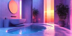 Sunset Sanctuary: A serene bathroom bathed in warm hues, with a freestanding tub overlooking a breathtaking sunset, inviting moments of tranquility and reflection
