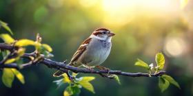 Tiny Songbird on a Branch: A House Sparrow Perched Amidst Spring's Awakening