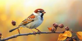 Tiny Songbird on a Branch: A House Sparrow Perched Amidst Spring's Awakening