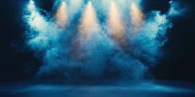 Stage Spotlight: A Mystical Scene of Blue Smoke Illuminated by a Cluster of Bright Stage Lights