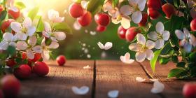 Springtime Bounty: Freshly Picked Apples and Delicate Blossoms Grace a Rustic Wooden Table, Basking in Warm Sunlight