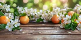 Springtime Bounty: Freshly Picked Apples and Delicate Blossoms Grace a Rustic Wooden Table, Basking in Warm Sunlight