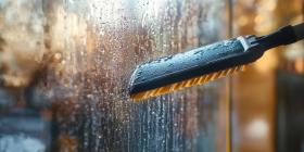 Window Cleaning in Progress: A Squeegee Against a Fogged-Up Pane, Revealing a Blurred Cityscape Beyond