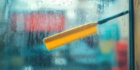 Window Cleaning in Progress: A Squeegee Against a Fogged-Up Pane, Revealing a Blurred Cityscape Beyond