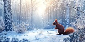 Winter Wonder: A Curious Red Squirrel Forages for Nuts in a Snowy Forest, with Sunlight Filtering Through the Trees