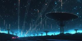Cosmic Road: A Path Illuminated by Red Lanterns, Leading Through a Snowy Forest Towards a Starry Night Sky