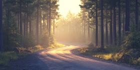 Sunlight-Kissed Road: A Winding Path Through a Verdant Forest, Bathed in Warm Morning Light
