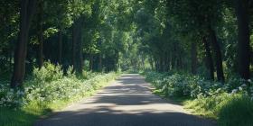 Sunlight-Kissed Road: A Winding Path Through a Verdant Forest, Bathed in Warm Morning Light