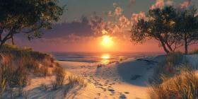 Crimson Coast: A Fiery Sunset Bathes the Beach in Warm Hues, Casting Long Shadows Across the Sand