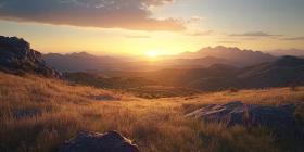 Golden Hour Panorama: A breathtaking vista unfolds as the sun dips below the horizon, casting a warm glow over rolling hills and distant mountains, painting a picture of tranquility and awe
