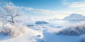 Winter Wonderland: A picturesque scene of snow-covered mountains, a tranquil lake, and a sky ablaze with the colors of a magical sunset, evokes a sense of serenity and wintertime enchantment