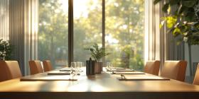 Morning Meeting: A sun-drenched boardroom, bathed in warm light, awaits a productive gathering, with a table set for collaboration and a view that inspires