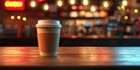 A Moment of Warmth: A steaming coffee, nestled in its cozy sleeve, awaits on a wooden counter in a dimly lit cafe, inviting a moment of relaxation and contemplation
