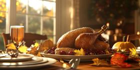 A Festive Feast: A golden-brown turkey, adorned with fresh grapes and nestled amidst a vibrant array of seasonal side dishes, takes center stage on a table laden with holiday cheer