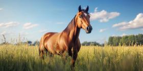 A Moment of Serenity: A chestnut horse, bathed in the warm glow of the morning sun, stands peacefully amidst a field of tall grass, embodying the tranquility of rural life