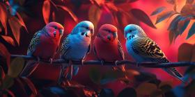 A Vibrant Trio: Three vibrant budgies, perched on a branch amidst a lush garden, showcase their colorful plumage and playful personalities