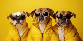 A Furry Fashion Trio: Three stylish canines, sporting sunglasses and matching yellow jackets, strike a pose with a touch of canine cool