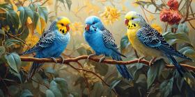 A Vibrant Trio: Three vibrant budgies, perched on a branch amidst a lush garden, showcase their colorful plumage and playful personalities