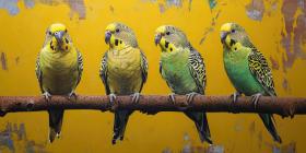 A Vibrant Trio: Three vibrant budgies, perched on a branch amidst a lush garden, showcase their colorful plumage and playful personalities