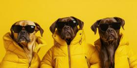 A Furry Fashion Trio: Three stylish canines, sporting sunglasses and matching yellow jackets, strike a pose with a touch of canine cool