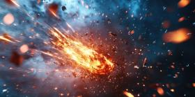 Cosmic Collision: A cataclysmic explosion erupts in a universe of chaos, sending a shower of debris and fiery fragments into the void of space