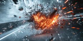 Cosmic Collision: A cataclysmic explosion erupts in a universe of chaos, sending a shower of debris and fiery fragments into the void of space